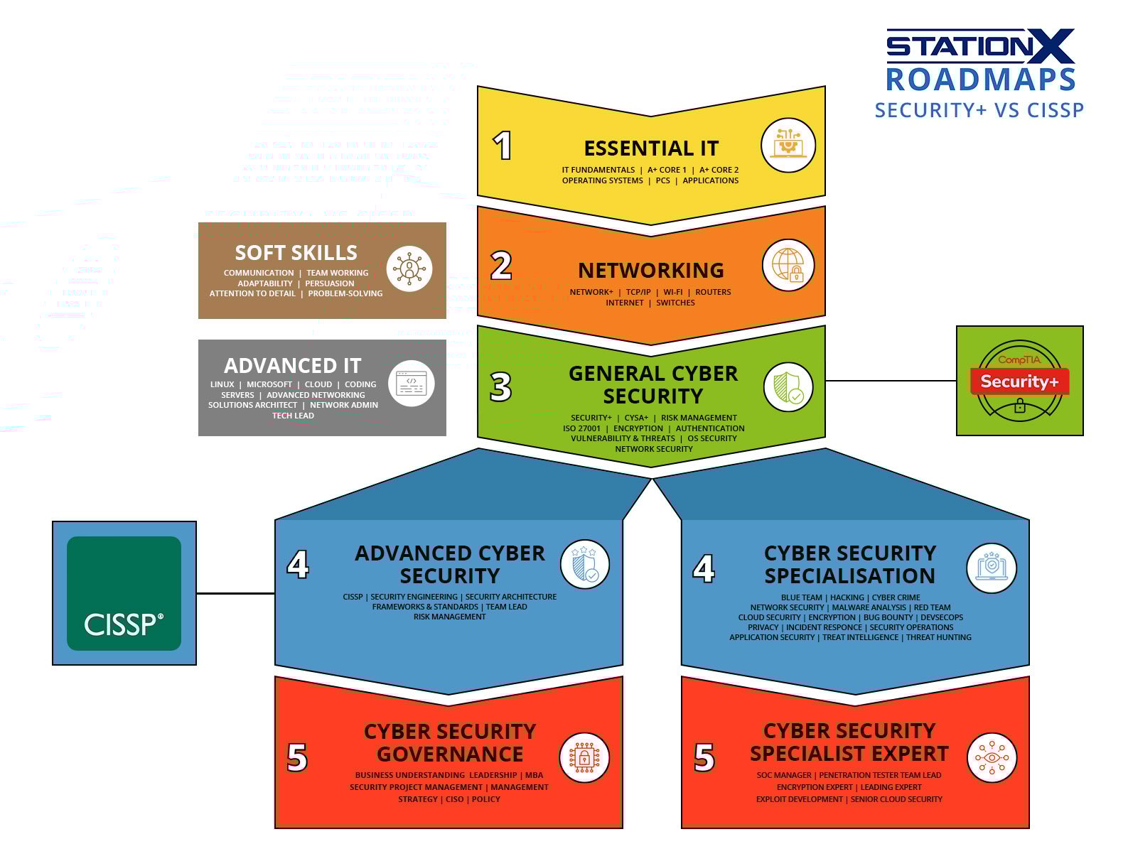 The format of the two exams are very similar, but their respective level of difficulty is far from equivalent. As you can see in the diagram below, Security+ is a certification you earn in the third stage of your career when preparing for general security-related positions.
