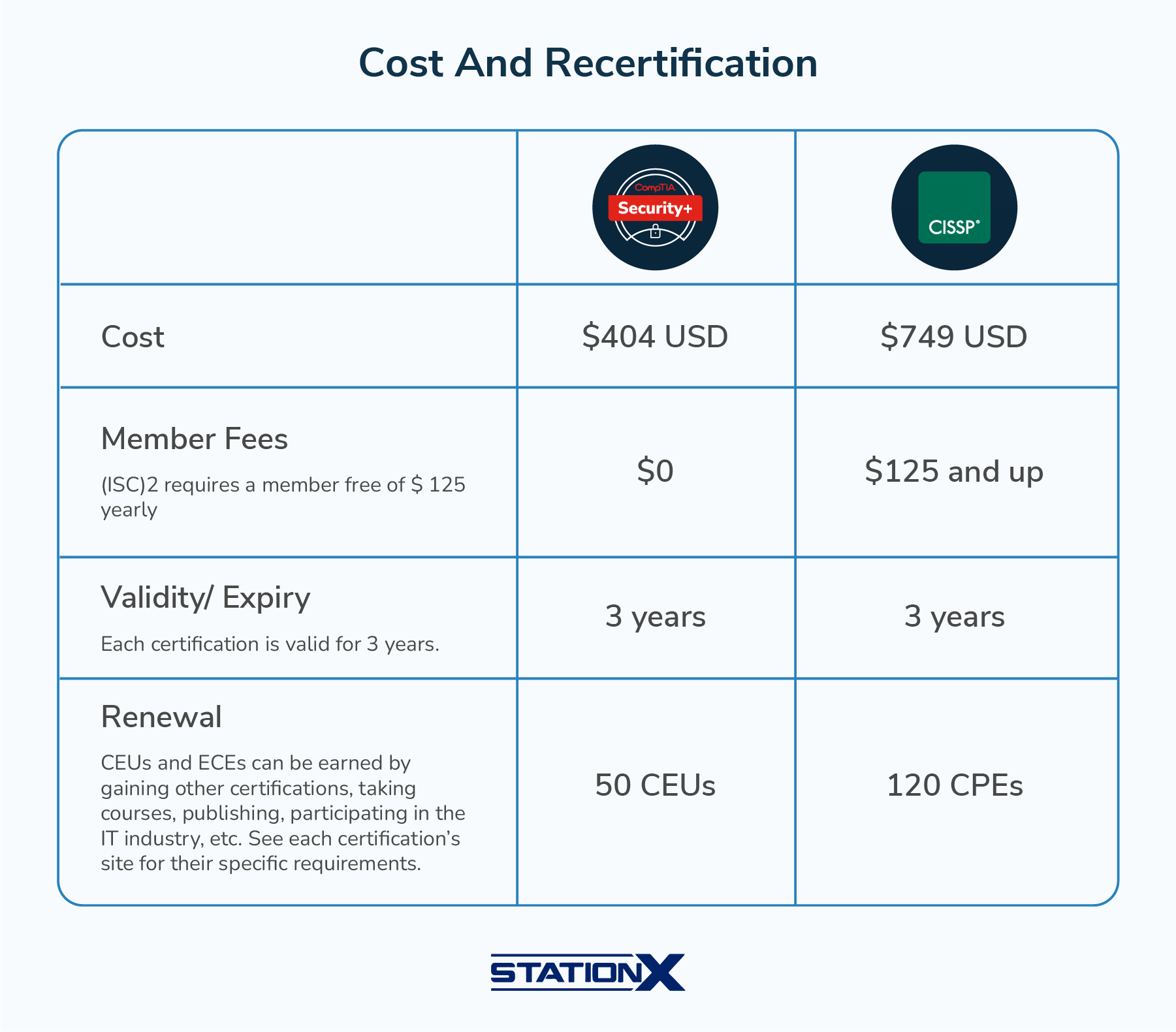 The cost of writing the CISSP exam is $749 USD compared to $404 USD for Security+. (ISC)2 also requires a membership fee of $125 yearly, which is not the case with CompTIA and Security+.