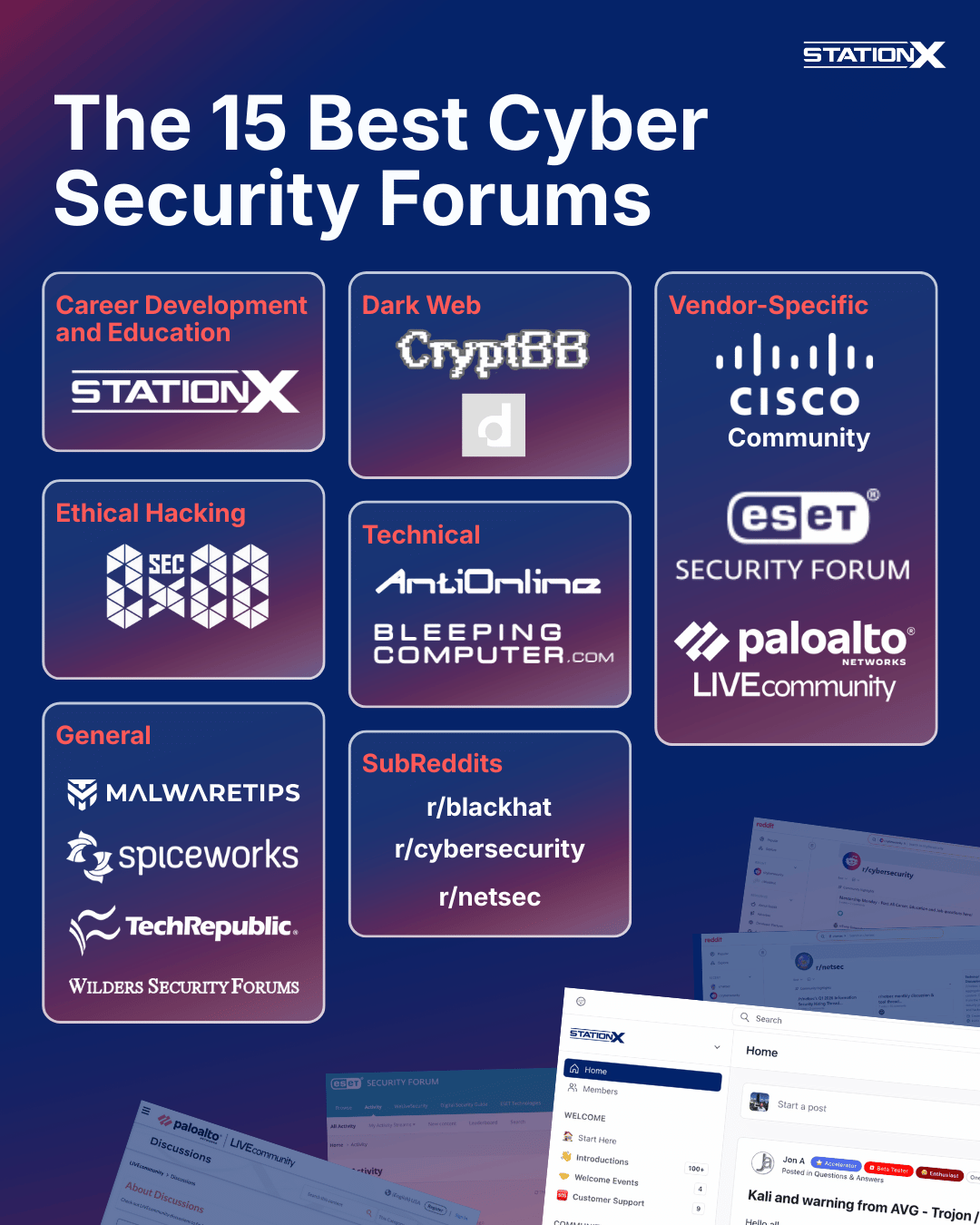 The StationX Community is a place where aspiring and established cyber security professionals alike can come together to exchange information, network, mentor, and learn what it takes to make it in cyber security.