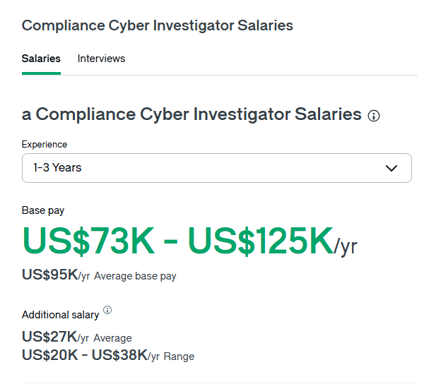 Keywords used in cyber security compliance job titles affect salaries. According to Glassdoor, the average yearly wage in USD of an Information Security and Compliance Officer is $87,000, that of a Junior Compliance Officer is $74,000, that of a Compliance Cyber Investigator is $95,000, and that of “Cyber Security GRC Analyst” (Governance, Risk and Compliance) is $85,000.