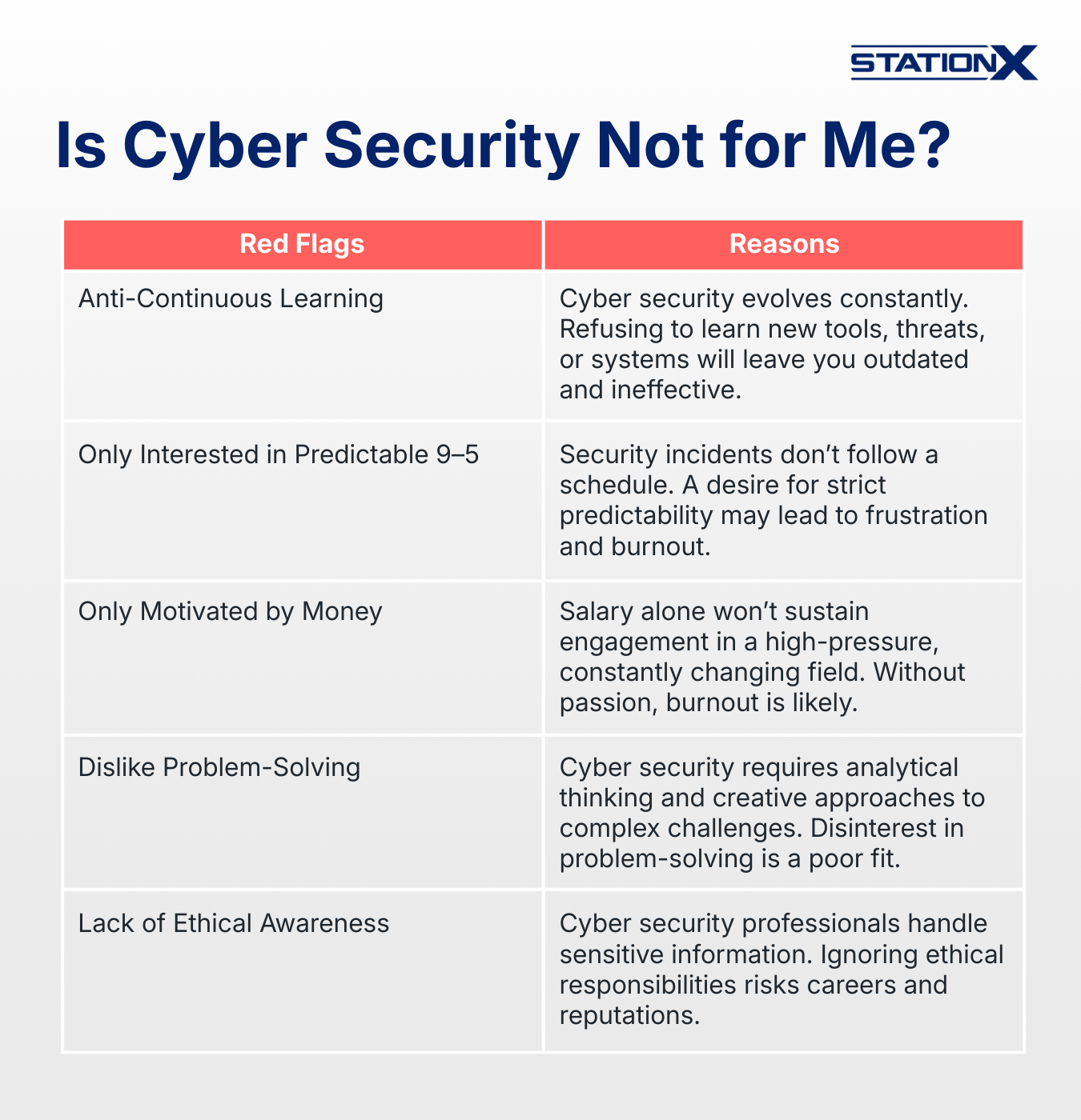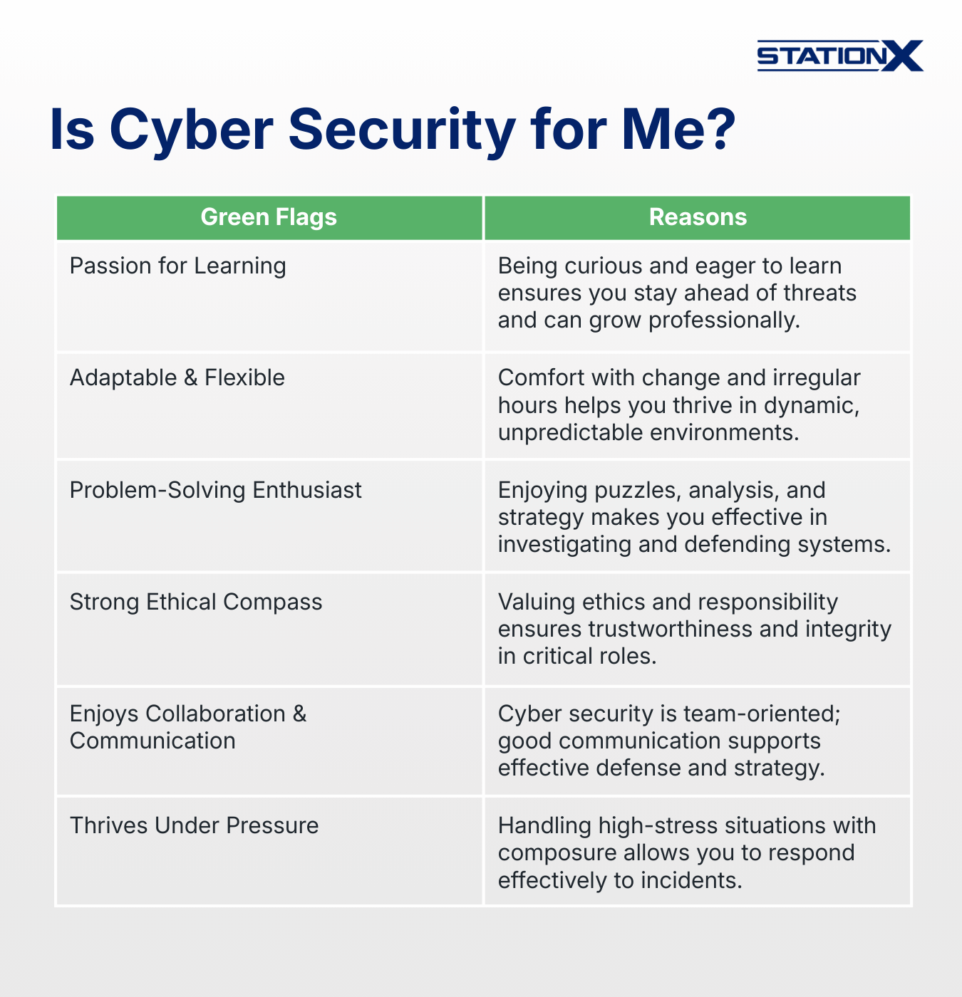 For example, maybe after answering “no” to a number of questions, you notice you currently lack a certain skill set. This doesn't mean you are not well suited for a career; it simply means you now understand what skills you need to work on if you want to transition into cyber security successfully.