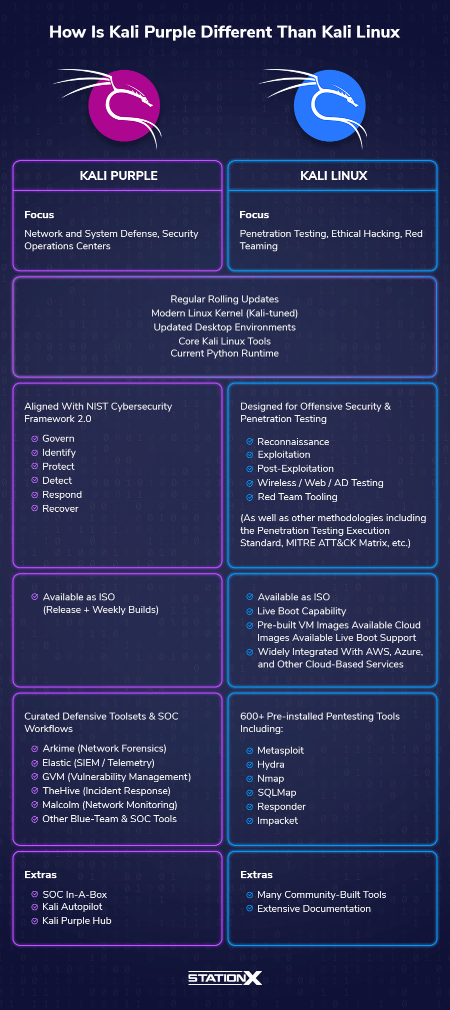 What changes with Kali Purple are the menu structure, meta-packages, documentation, and SOC-style workflow orientation - essentially positioning Kali as a “defensive security lab” rather than a traditional offensive toolkit.